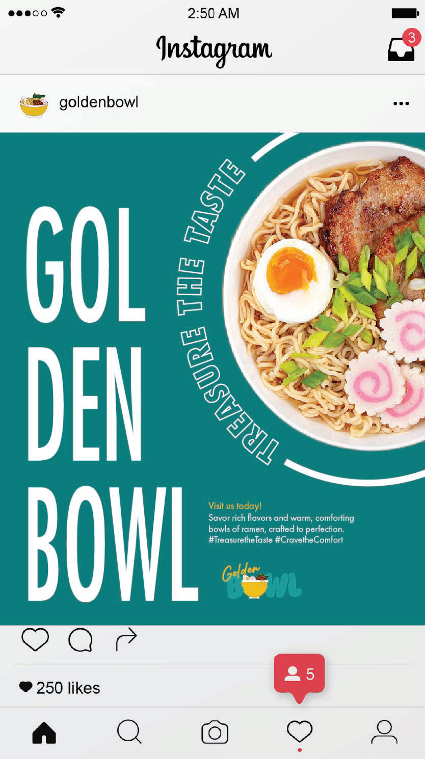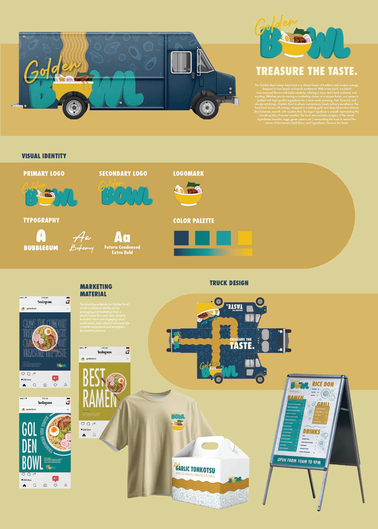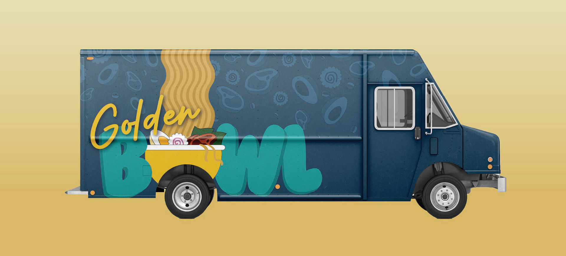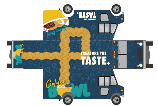 The Golden Bowl ramen food truck is a vibrant fusion of tradition and modern energy, designed to turn heads and spark excitement. Wrapped in a striking gold and deep blue color scheme, the truck balances warmth with contemporary flair. The smooth typeface of the logo reflects the texture of ramen noodles, while illustrated ingredients—noodles, eggs, green onions, and more—surround the truck, highlighting the freshness and quality of the food. Each bowl blends time-honored flavors with bold creativity for a fast, flavorful, and satisfying experience. Treasure the Taste!