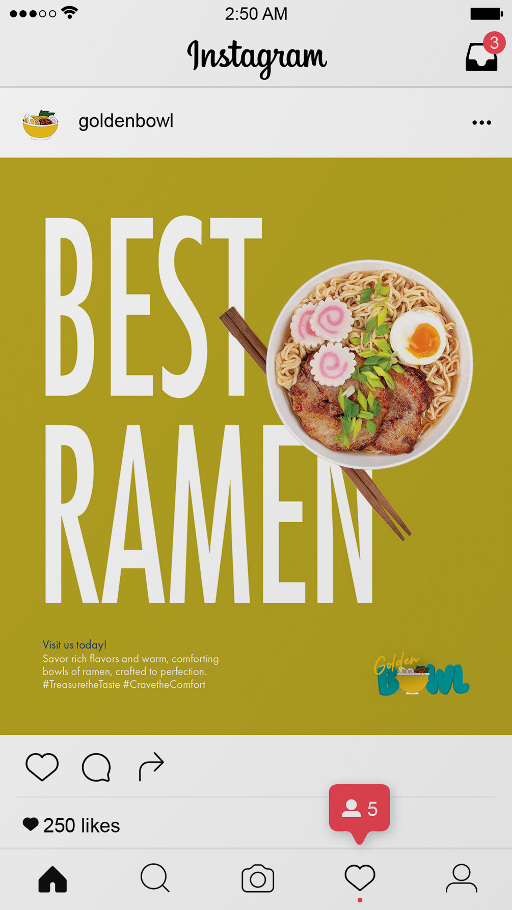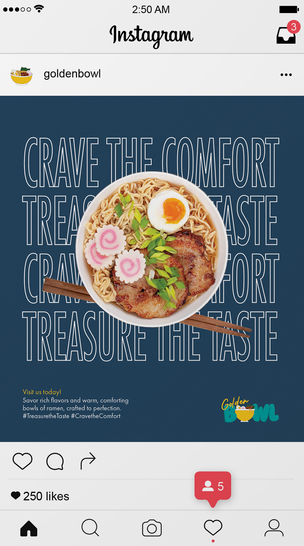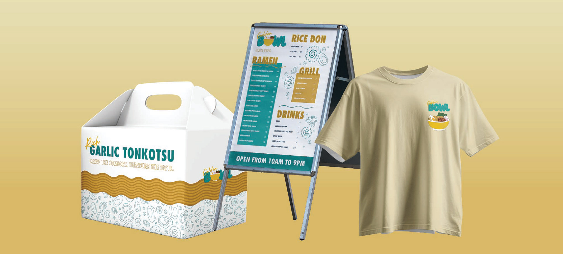 The Golden Bowl ramen food truck is a vibrant fusion of tradition and modern energy, designed to turn heads and spark excitement. Wrapped in a striking gold and deep blue color scheme, the truck balances warmth with contemporary flair. The smooth typeface of the logo reflects the texture of ramen noodles, while illustrated ingredients—noodles, eggs, green onions, and more—surround the truck, highlighting the freshness and quality of the food. Each bowl blends time-honored flavors with bold creativity for a fast, flavorful, and satisfying experience. Treasure the Taste!