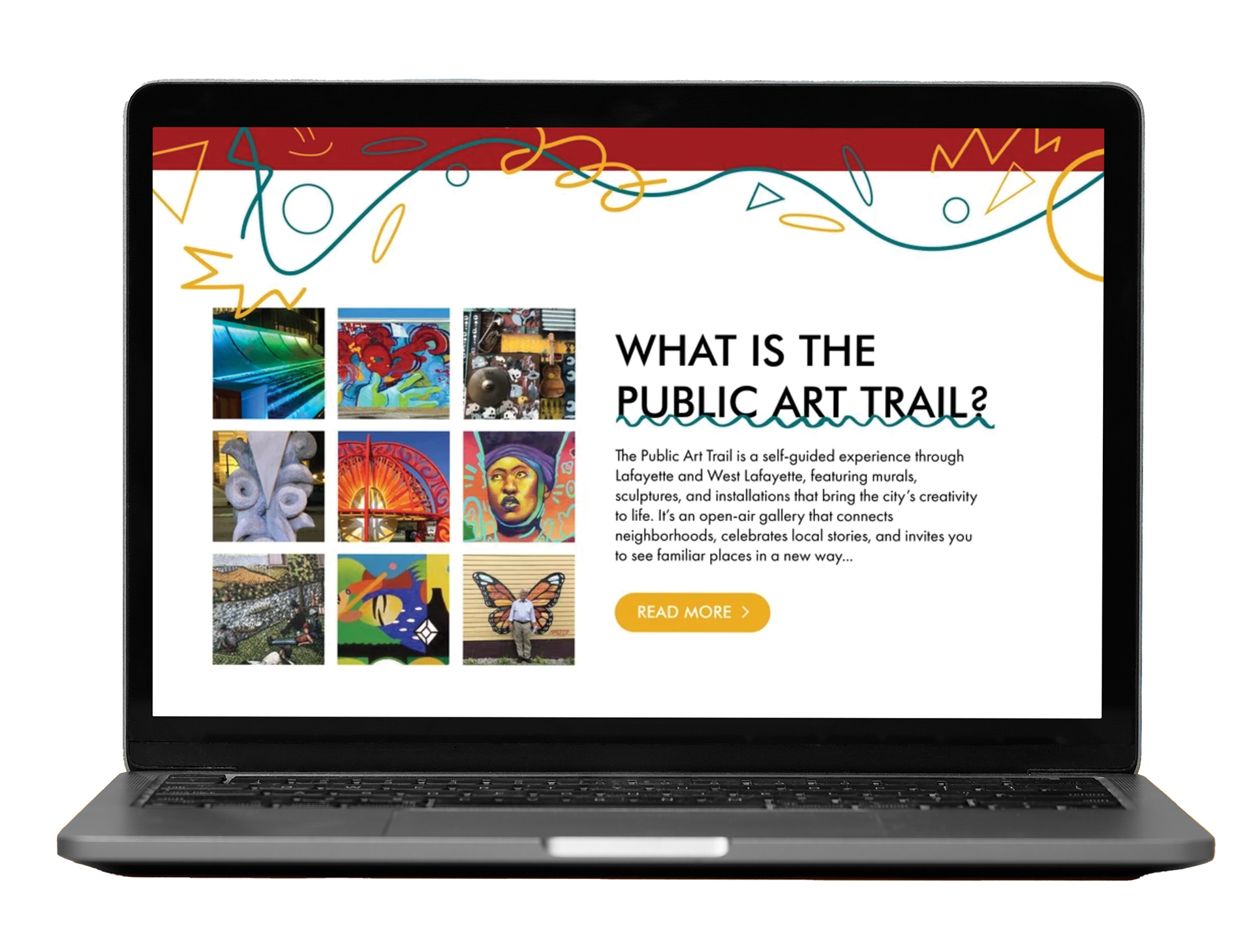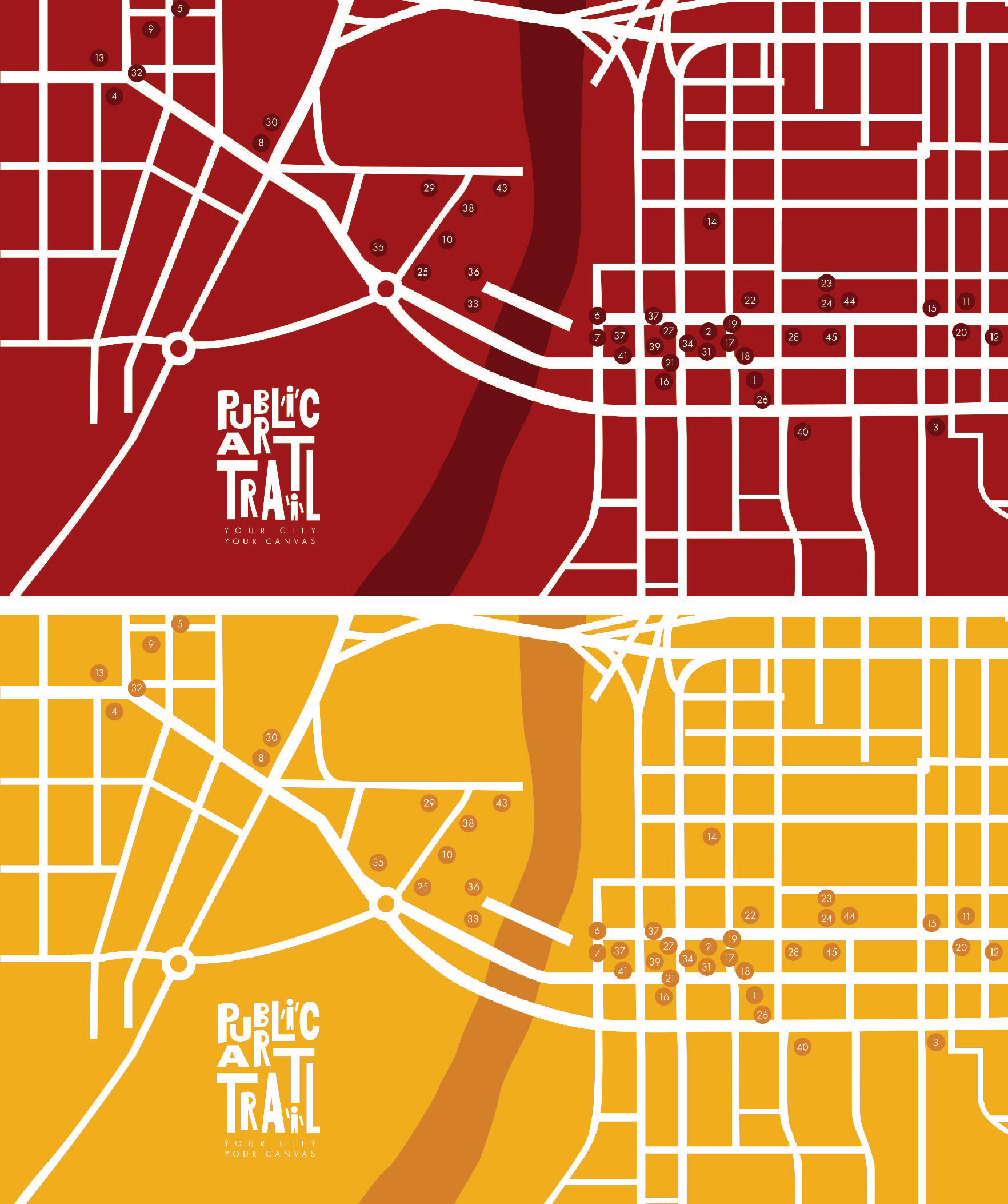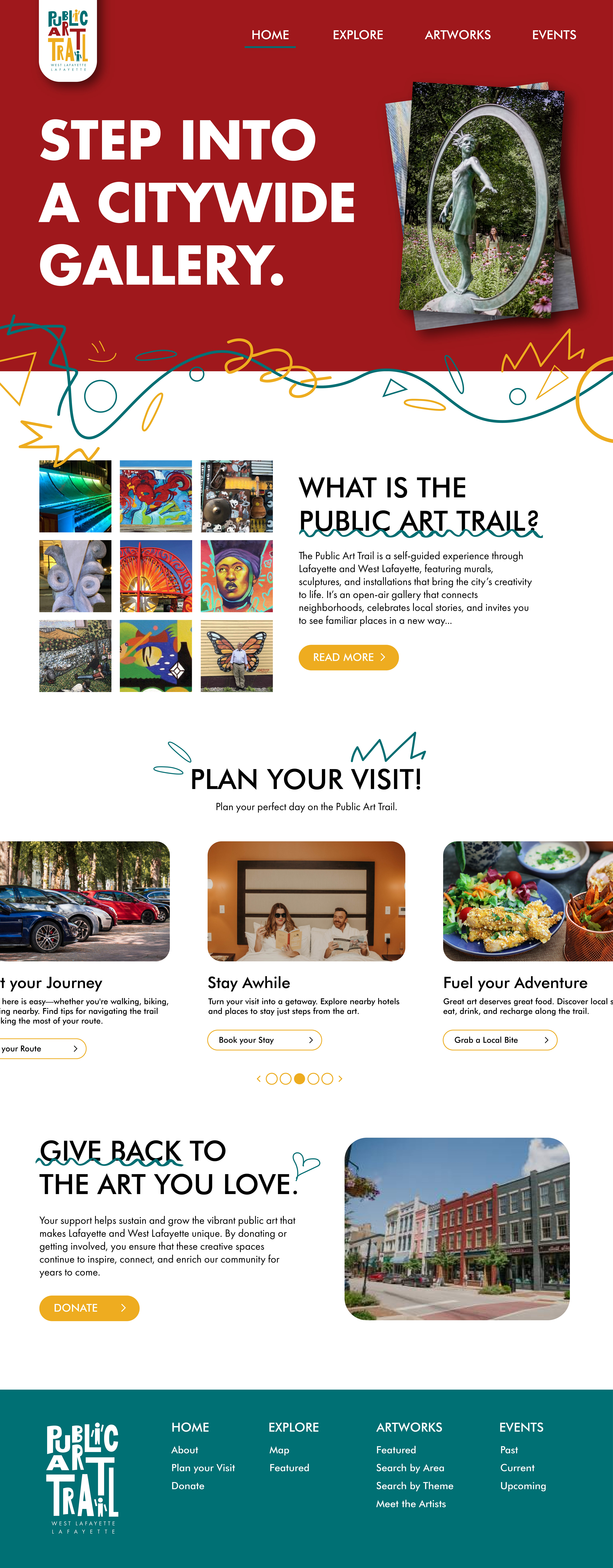 The Public Art Trail is a space located in West Lafayette and Lafayette Indiana that outlines the free, public art that people have access to. For the Public Art Trail, I wanted to capture the energy of the project through bold, primary colors and a playful design that resonates with a younger audience. The goal was to make the trail feel approachable, vibrant, and full of energy—like the city itself. With elements like the map, banner signage, and website, I aimed to create a sense of excitement and discovery, encouraging people to explore and interact with the public art in a way that's fun and engaging. It’s not just about looking at art; it’s about experiencing the city as a living canvas, where everyone is invited to contribute to the creative atmosphere.