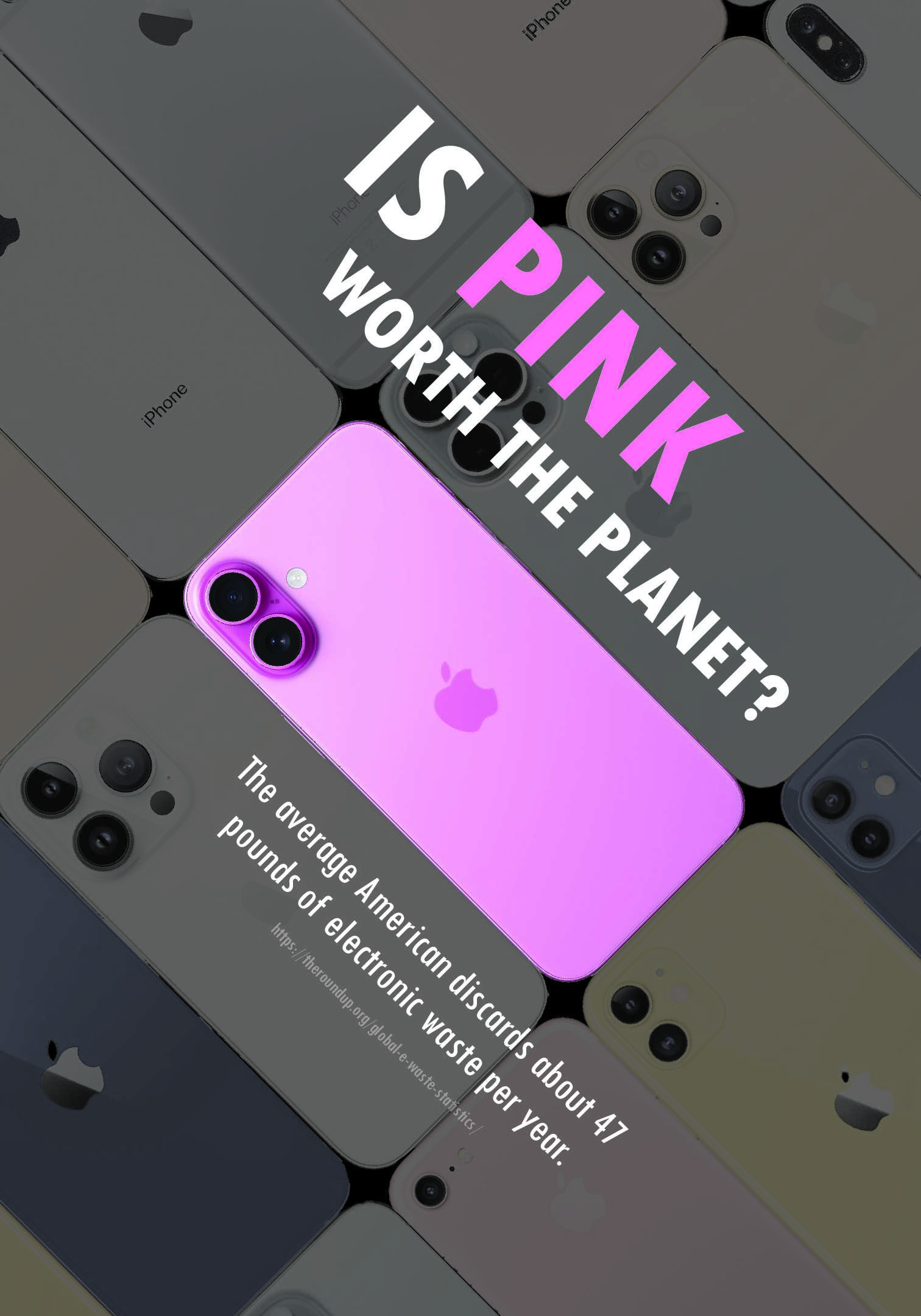This poster explores the intersection of aesthetic appeal and environmental impact, using the hot pink iPhone 16 as a symbol of overconsumption and e-waste. While the phone’s eye-catching color draws attention, it also underscores the lack of meaningful upgrades—prompting questions about our consumer habits. My design uses vibrant color, dynamic typography, and imagery of the phone to strike a balance between visual appeal and a critical message. The goal was to engage viewers and encourage reflection on the environmental cost of frequently upgrading electronics, ultimately advocating for more sustainable choices in technology use.
