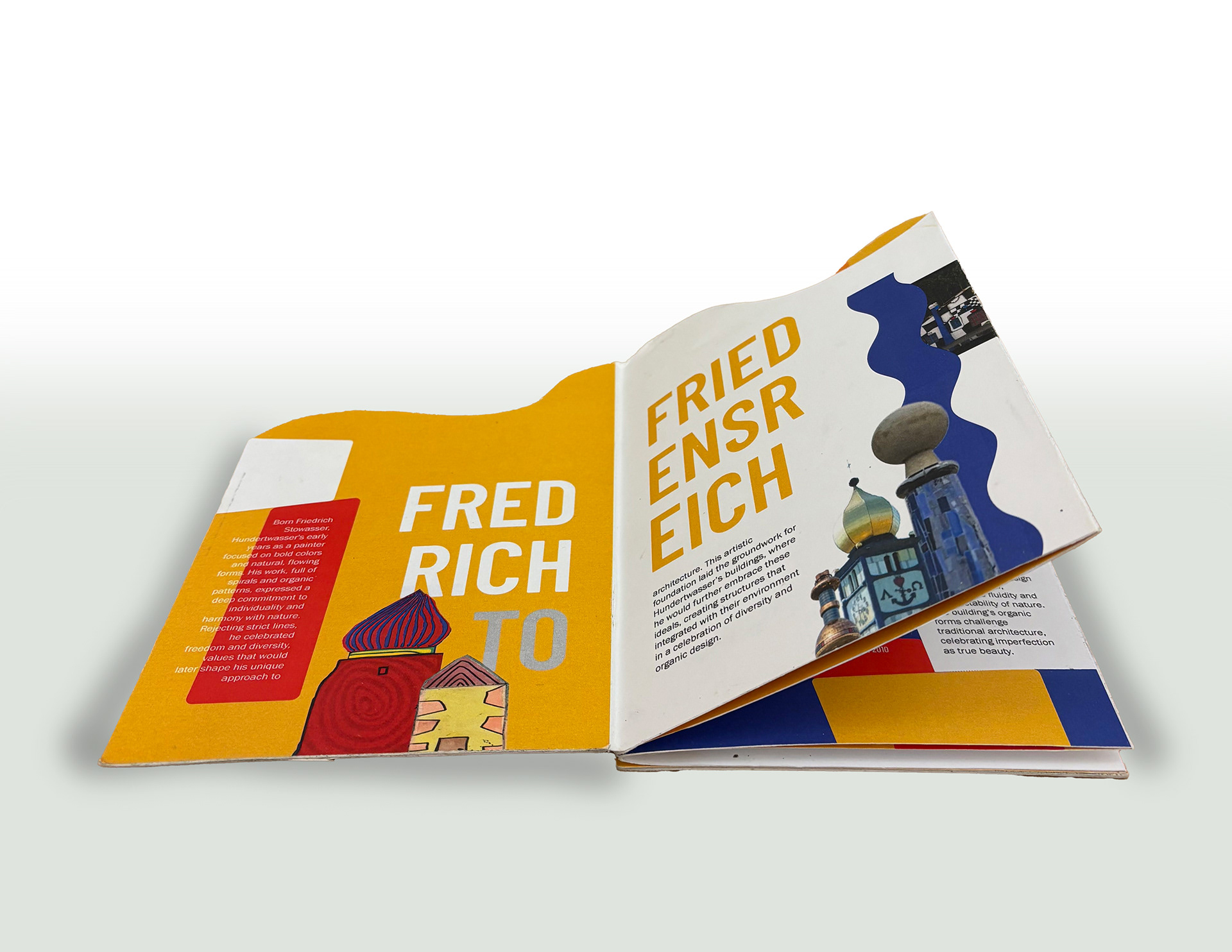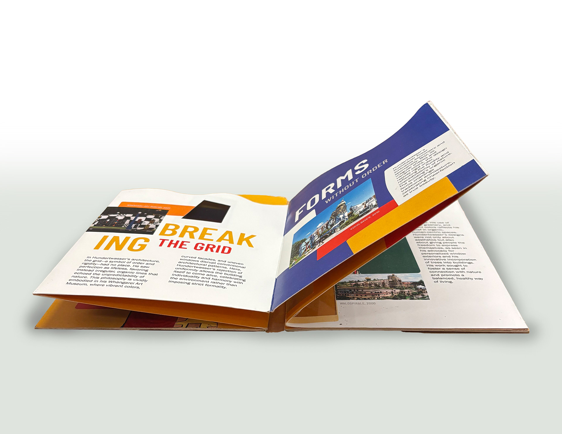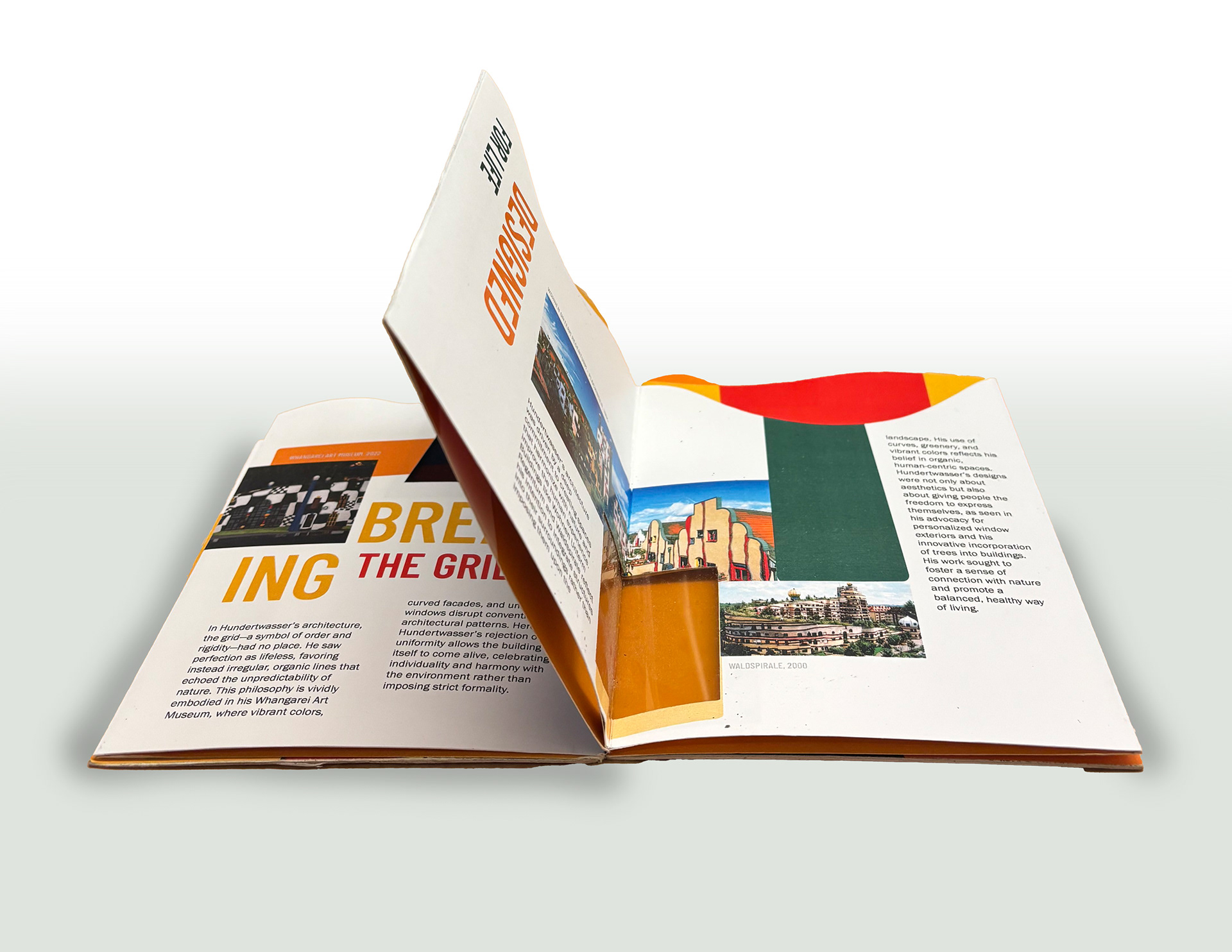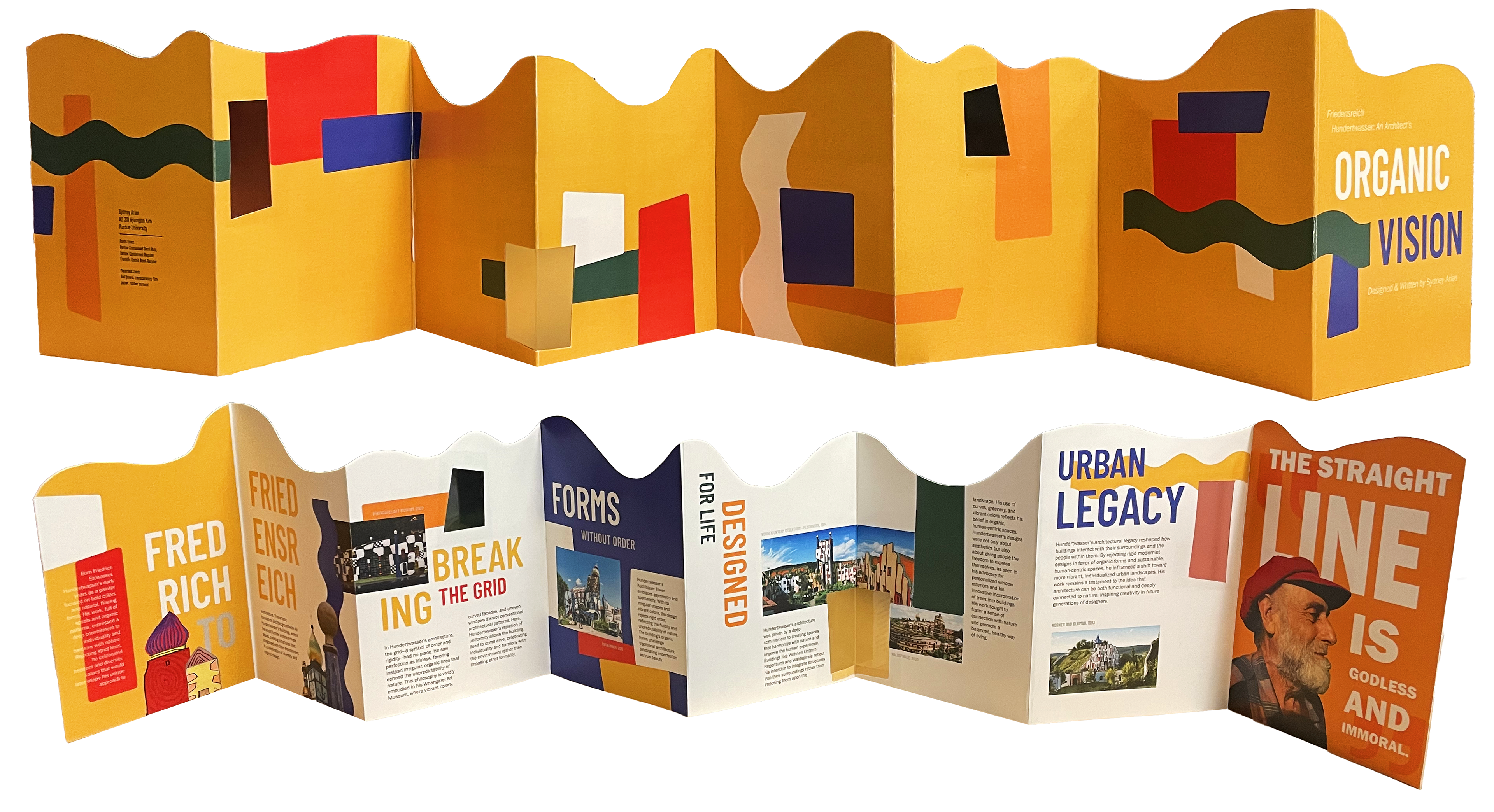 This experimental booklet explores the visionary architecture of Friedensreich Hundertwasser through an unconventional accordion format. Inspired by his embrace of irregularity and nature, I incorporated wavy lines, organic shapes, vibrant colors, and transparent film elements to reflect his bold artistic style. The design moves beyond standard spread layouts, creating a tactile and immersive experience that invites readers to engage with Hundertwasser’s philosophy in a hands-on, visually dynamic way.