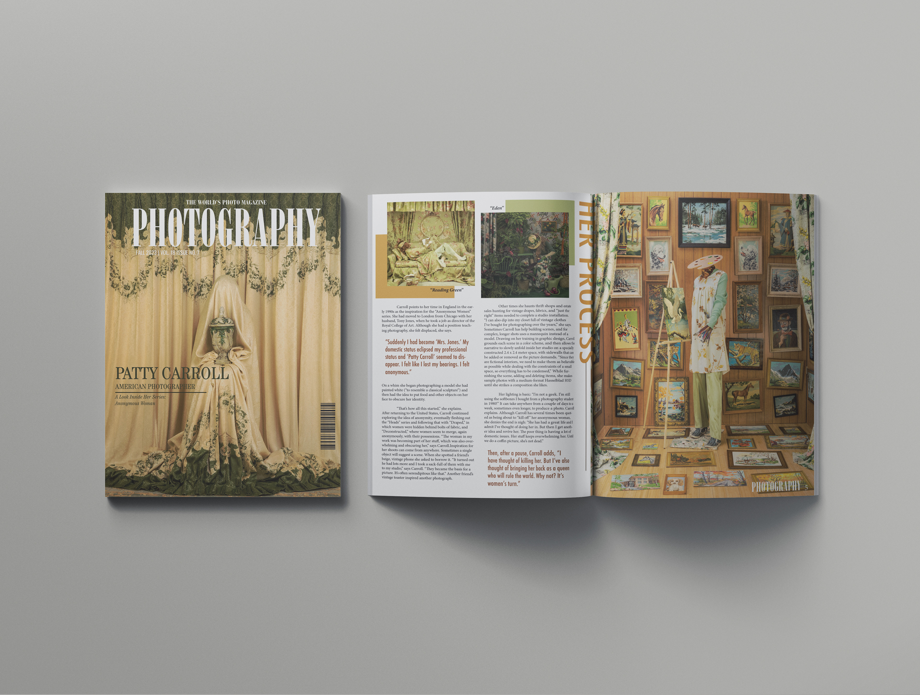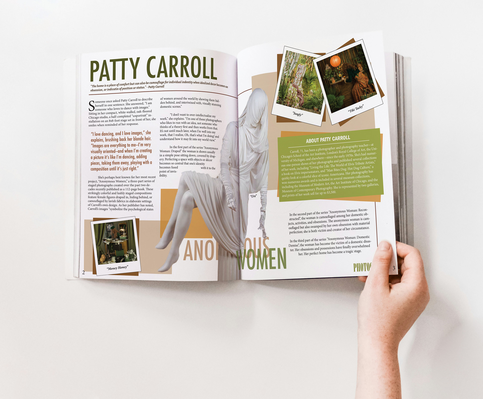 For this magazine spread, I featured photographer Patty Carroll and her “Anonymous Woman” series, which critiques the way society defines women through domestic roles. Carroll’s vibrant, staged scenes—where the subject’s identity is hidden—guided my design choices. I selected an earth-toned palette to complement her work, chose images that best represented her range, and arranged them to create visual flow across the spreads. The layouts maintain an organic feel, with design elements extending seamlessly across both pages to unify the composition.