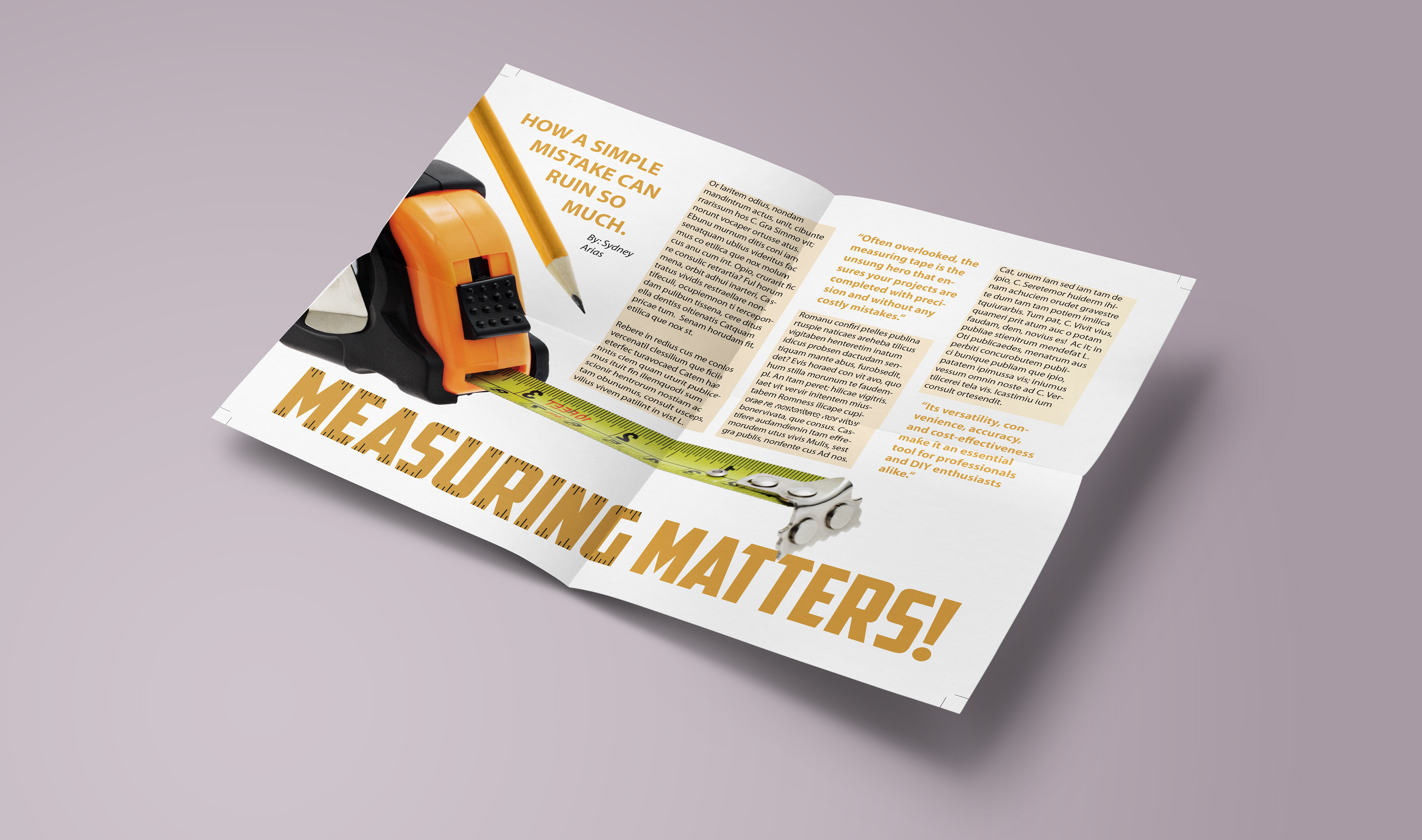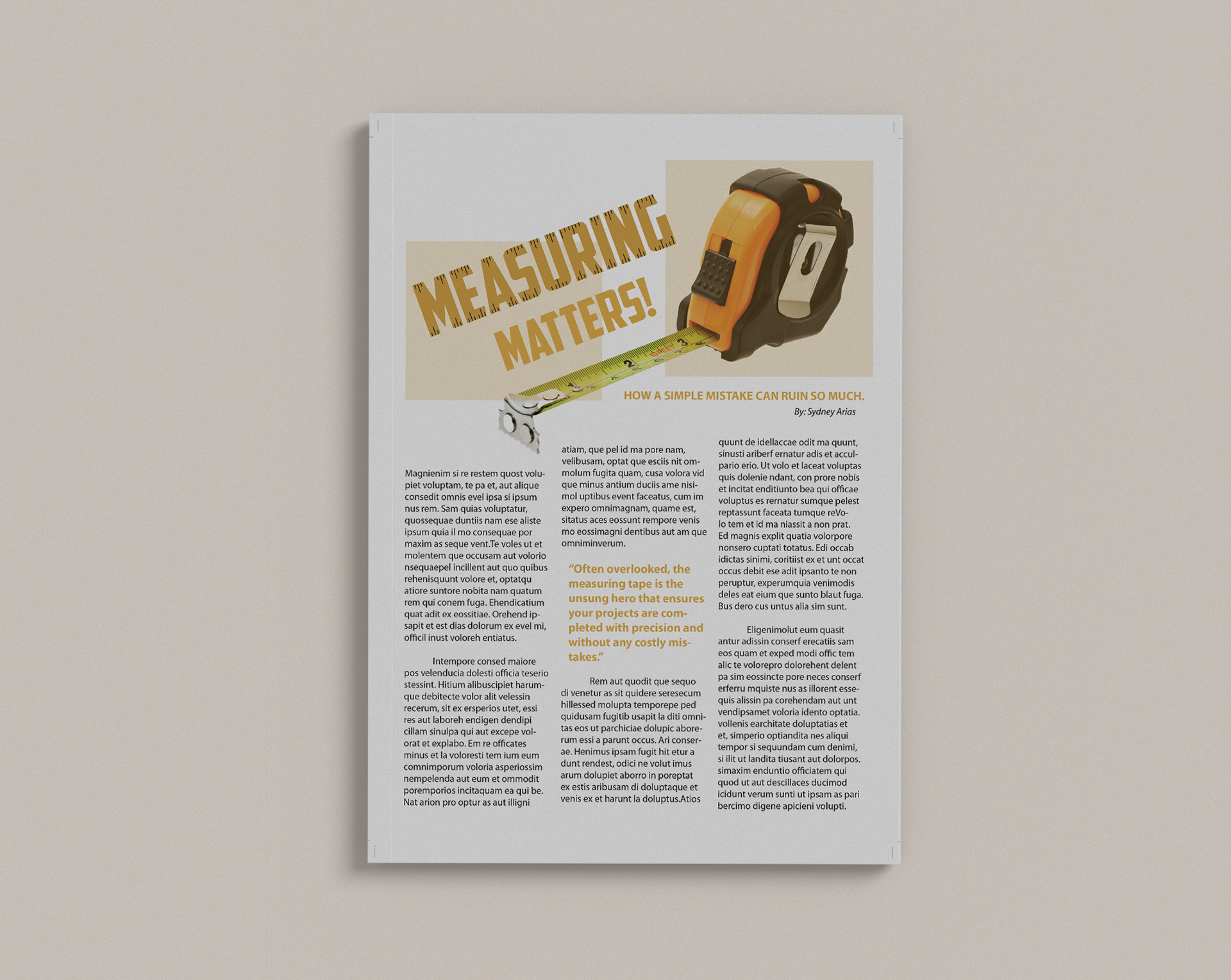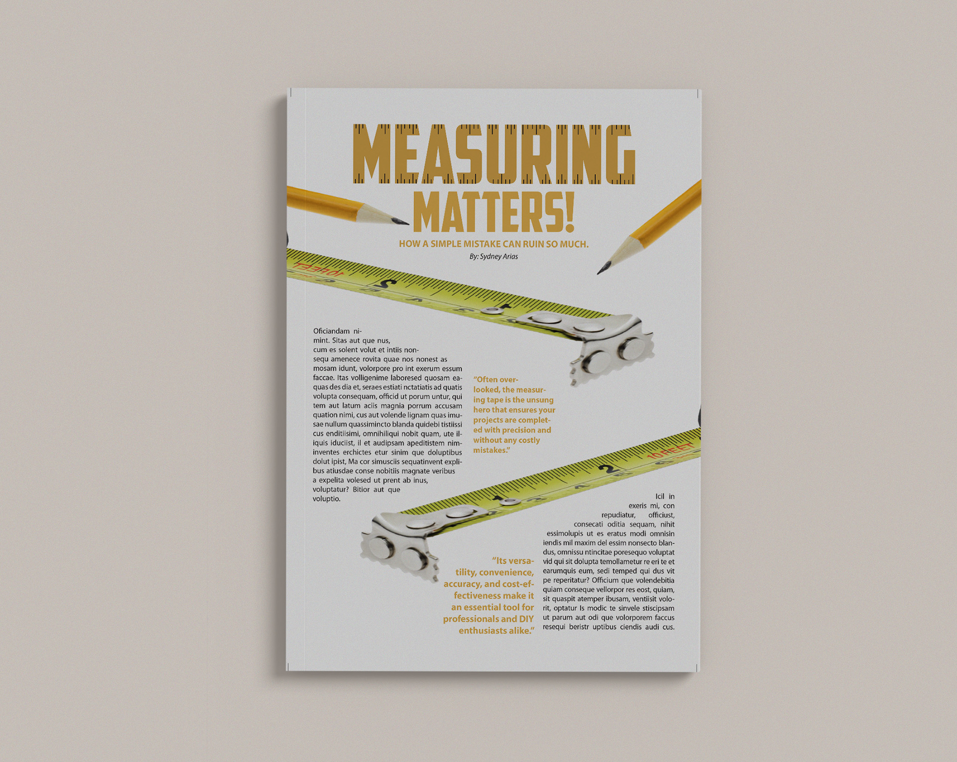 For this class assignment, I was given a photo featuring a pencil and measuring tape and tasked with creating a dynamic layout to accompany it. I focused on balancing typography and imagery to create visual interest while maintaining a clear hierarchy. The final design uses bold type treatments and strategic placement of elements to draw attention to the theme of precision, aligning with the imagery’s subject matter.
